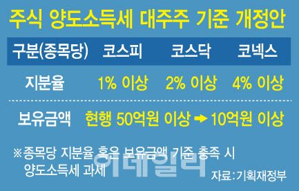 세금 수입 측면에선 이번 주식 양도세 대주주 기준을 현행 50억원에서 10억원으로 강화하면, 연간 약 2000억원의 세입이 발생하는 것으로 기재부는 추산했다. 이는 단순 계산상 이재명 대통령의 핵심 공약이자 이번 세제 개편안에 포함된 ‘자녀 수에 따른 신용카드 등 소득공제 한도 확대’(최대 400만원)에 따른 세 감소분(연 3000억원)을 꽤 메울 수 있는 액수다.