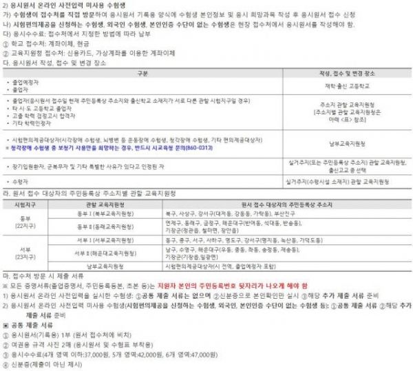 졸업생과 검정고시 합격자 중 응시 수수료 면제 대상자는 접수처 방문 시 반드시 증빙 서류를 제출해야 한다. 중증·경증 시각·청각장애 등 시험 편의 제공 대상자는 장애인 증명서와 장애인등록증(복지카드) 사본, 병원장 발행 진단서, 학교장 확인서 등을 준비해야 한다.