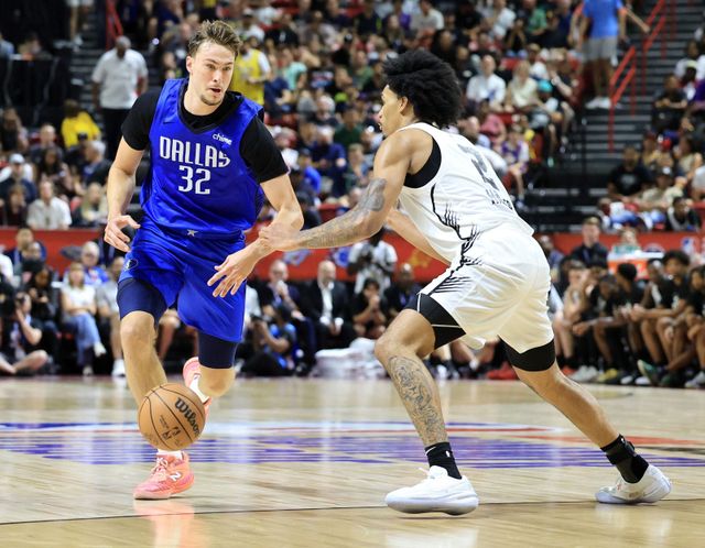 LAS VEGAS, NEVADA - JULY 12: Cooper Flagg #32 of the Dallas Mavericks brings the ball up the court against Dylan Harper #2 of the San Antonio Spurs in the second half of a 2025 NBA Summer League game at the Thomas & Mack Center on July 12, 2025 in Las Vegas, Nevada. NOTE TO USER: User expressly acknowledges and agrees that, by downloading and or using this photograph, User is consenting to the terms and conditions of the Getty Images License Agreement. Ethan Miller/Getty Images/AFP (Photo by Ethan Miller / GETTY IMAGES NORTH AMERICA / Getty Images via AFP)/2025-07-13 18:02:09/
