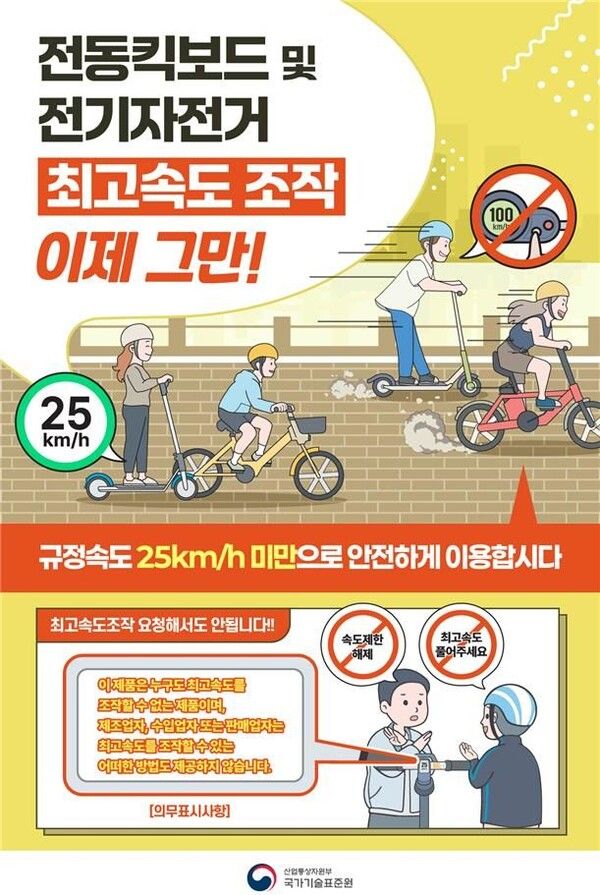산업통상자원부 국가기술표준원이 전동킥보드·전기자전거의 최고속도 불법조작 방지를 위한 안전기준을 마련하고, 관련 표시사항을 의무화한다고 24일 밝혔다.