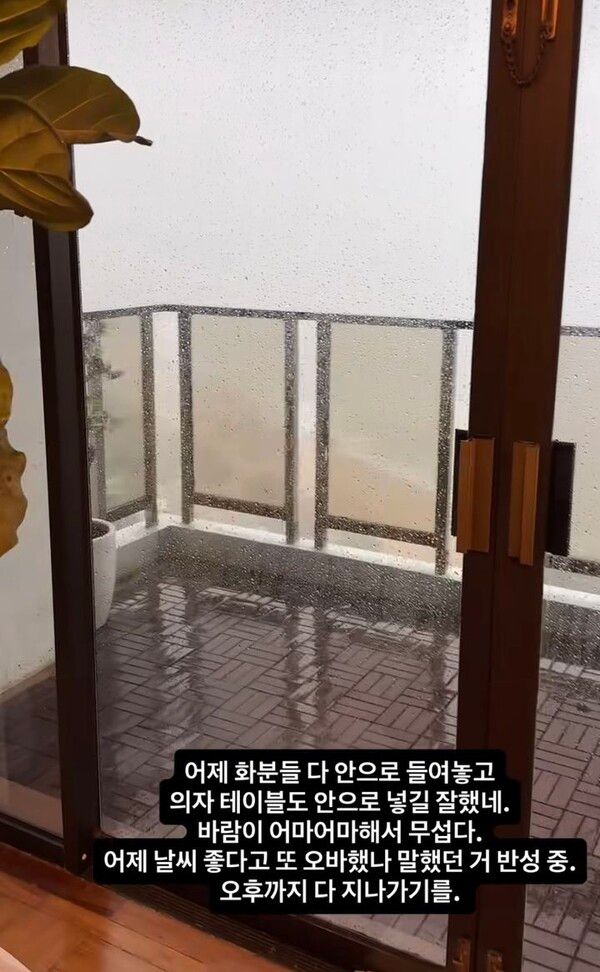 영상 속에서 테라스 바닥은 빗물로 흥건하다. 화분에 심겨져 있는 식물은 비바람에 휘날리고 있다.