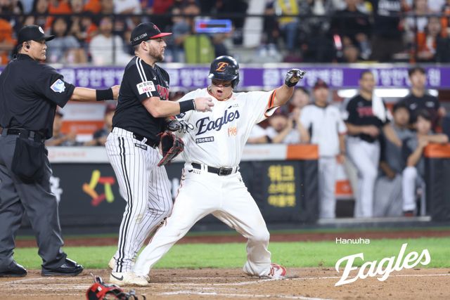 하지만 여기서 대반전이 일어났다. 노시환이 갑자기 태세를 바꿔 박동원 바로 앞에서 몸을 비틀고는 홈플레이트로 내달린 것이다. 박동원이 허겁지겁 노시환을 태그했으나 공이 없는 빈 글러브였다.