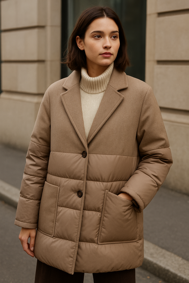 특징: 겉모습은 울 코트처럼 깔끔하고 클래식하지만, 안에는 패딩 충전재가 들어 있어 보온성을 챙긴 아우터.