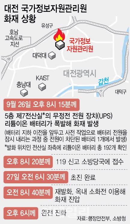 28일 정부 등에 따르면 지난 26일 밤 8시 15분쯤 대전 유성구에 위치한 국정자원에서 화재가 발생했다. 5층 전산실에서 13명의 작업자들이 리튬배터리 이전 작업을 하던 중 배터리 1개에서 불꽃이 튀어 발화한 것으로 추정된다.