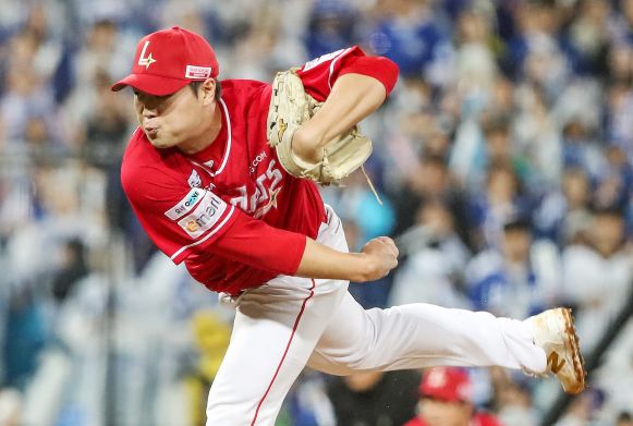 9일 인천 SSG랜더스필드에서 열린 2025 프로야구 KBO리그 포스트시즌 준플레이오프 1차전 삼성 라이온즈와 SSG 랜더스의 경기. 4회초 교체된 SSG 박시후가 역투하고 있다. 2025.10.9 [연합뉴스]