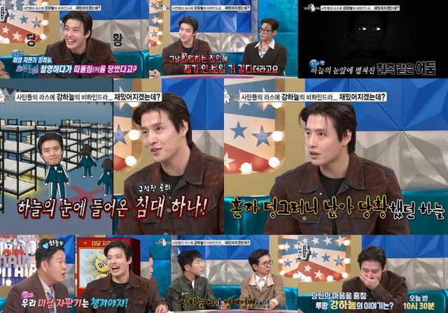 MC 김국진은 강하늘에게 “‘오징어 게임’ 촬영하다가 따돌림을 당했다고?”라고 질문했다. 강하늘은 손사래를 치며 당황하는 모습을 보였다.