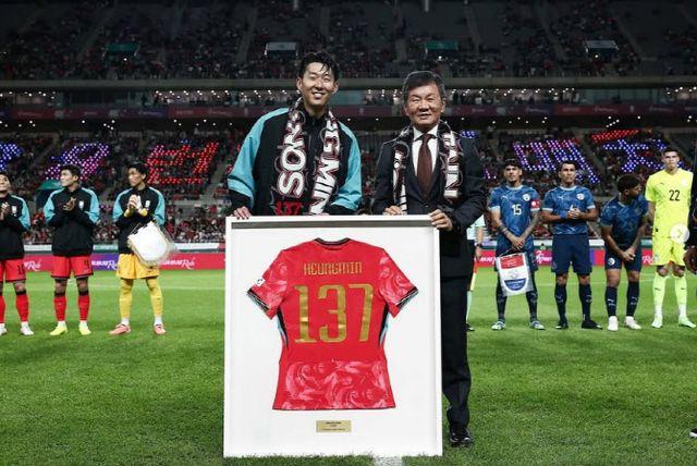 14일 서울월드컵경기장에서 열린 파라과이전 킥오프에 앞서서는 손흥민의 기록 달성을 축하하는 기념행사가 열렸다. 행사명은 ‘레전드 올드 앤드 뉴 - 프롬 차, 투 손’(Legend Old & New - From Cha, To. Son)으로 차범근 전 감독이 직접 자리해 손흥민에게 숫자 ‘137’이 써진 유니폼을 전달했다. 정 회장도 손흥민에게 기념 머플러를 주며 축하 인사를 건넸다.