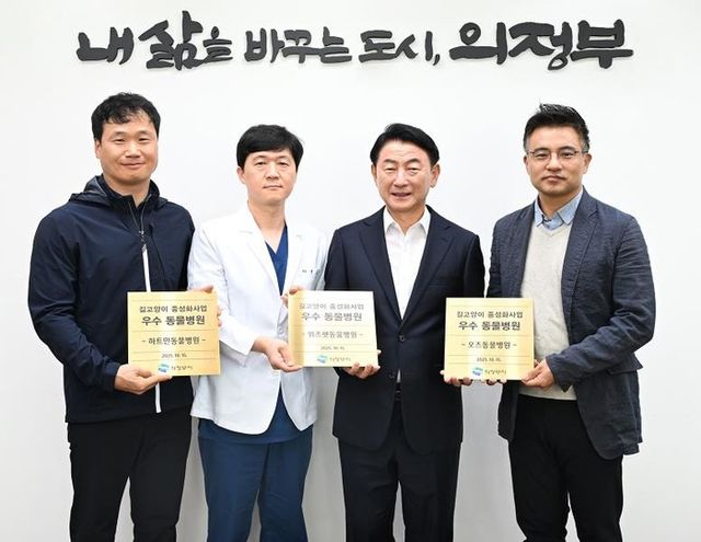 [파이낸셜경제=김영란 기자] 의정부시는 10월 15일 시장실에서 ‘길고양이 중성화사업 우수 동물병원’ 인증패 전달식을 열고, 사업에 적극 참여해 지역 동물복지 문화 확산에 기여한 동물병원을 격려했다.