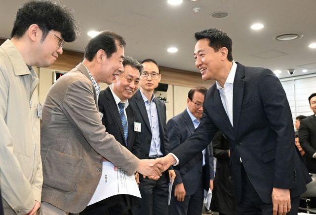 오세훈 서울시장이 16일 서울시청에서 열린 '주택공급 활성화를 위한 민‧관정책협의회'에서 서울시 정비사업연합회 주민대표들과 인사를 나누고 있다. © 서울시