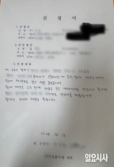 이번 사건에 대해 A씨는 지난 16일, <일요시사>와의 전화 통화에서 “일단 경찰 수사과에 진정서를 제출했다”며 “지자체에도 문의했지만 ‘어떤 법을 적용해야 할지 모호하다’는 답변을 받았고, 증거를 모은 후 다시 찾아갈 예정”이라고 밝혔다.