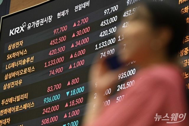 반도체주 랠리 등의 영향으로 코스피가 사상 첫 3700선을 돌파한 16일 오후 서울 여의도 한국거래소에 마련된 현황판에서 삼성전자·SK하이닉스 등의 종가가 보이고 있다. 사진=강민석 기자 kms@newsway.co.kr