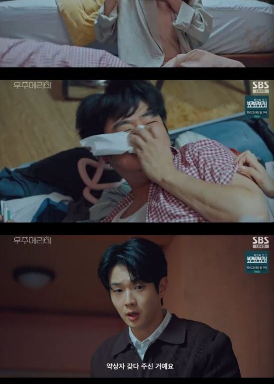 지난 17일 방송된 SBS 금토드라마 '우주메리미' 3회에서는 가짜 부부라는 것을 들키지 않기 위해 셀프 웨딩촬영을 하는 김우주(최우식 분)와 유메리(정소민)의 모습이 그려졌다.