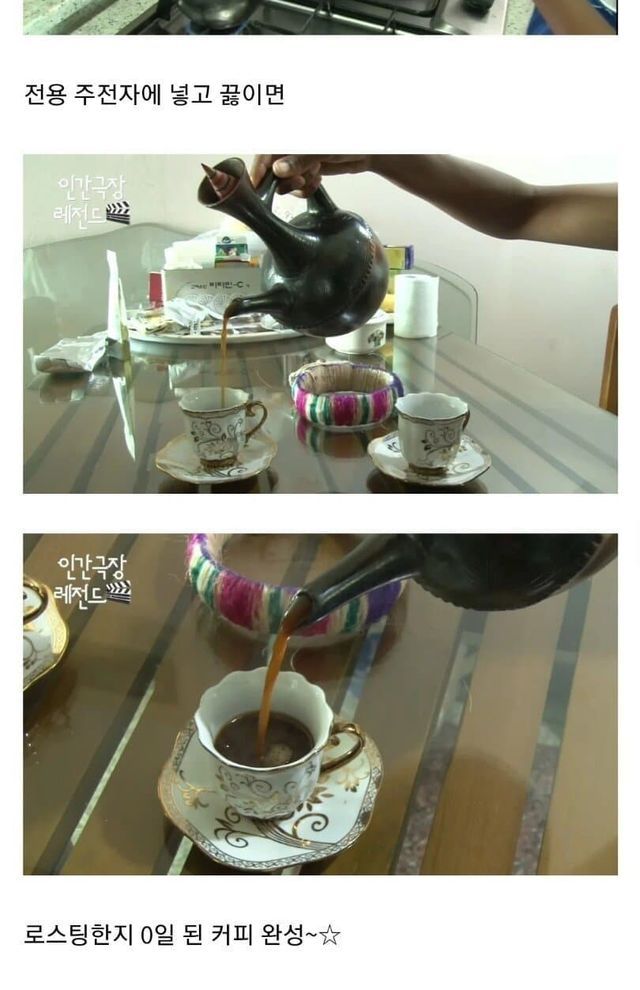 직접 고향에서 가져온 에티오피아산 커피 원두 수제로 로스팅하고, 그라인더에 갈아서 전용 주전자에 담아 추출한 에스프레소