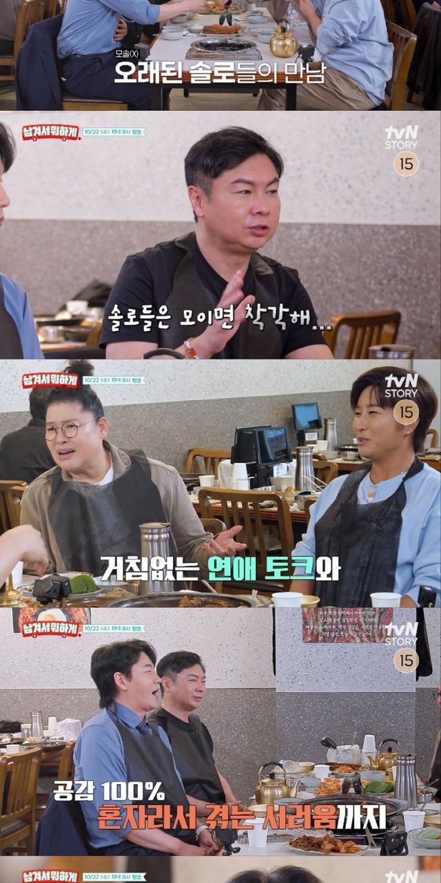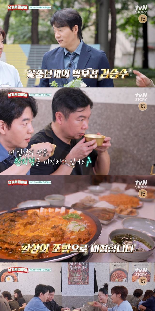 더불어 연예계 대표 싱글 남녀 이영자-박세리, 김승수-임원희 네 사람의 본격 연애 토크가 이어져 흥미를 고조시킨다. 연애담부터 이상형 토크, 연애 상담까지 이어지는 솔로 남녀들의 솔직한 이야기가 무르익는 가운데, 6살 연상 김승수의 박세리를 향한 폭풍 플러팅이 이어진다. 평소 ‘월클’다운 아우라로 함부로 말을 놓기 어려운 인상의 박세리에게 단숨에 말을 놓고, 급기야 “애기야”라고 부르며 플러팅을 이어가 박세리의 마음을 설레게 하는 것. 김승수의 연상미 폭발 플러팅 세례에 임원희는 “이분 아까 술 드셨어요?”라고 물어 폭소를 유발한다.