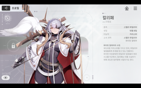 5성 ‘칼리페’는 각종 방어 능력에 기반한 공격을 펼치는 캐릭터로, 카드 또한 실드 부여 및 자신의 방어력에 기반한 피해를 입히는 카드를 보유하고 있다. 특히, ‘대검 아퀼라’ 카드와 ‘벌쳐 사출’ 카드의 강력한 연계 사이클이 ‘칼리페’의 성능을 극대화한다. 공방일체의 활약은 물론 홀로 시너지 극대화를 할 수 있는 패 순환 능력이 강점으로 꼽힌다.
