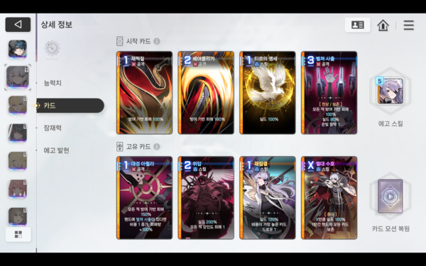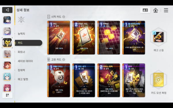 퀘스트 카드의 능력에 따라 핸드 드로우, 버프 및 디버프 부여, 적 피해 등 다양한 형태로 운용이 가능하다. 세이브 데이터 축적에 따라 퀘스트 카드의 활용법은 더욱 다채로워진다. 특히, 4성 캐릭터라는 점에서 캐릭터 돌파 ‘에고 발현’이 5성 대비 손쉬운 점이라는 점이 강점이다.