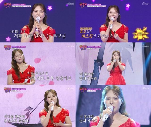 이에 힘을 받은 미스김은 “소문에 대한 억울함을 노래로 풀겠다”며 부모님이 좋아하는 곡인 나훈아 원곡의 ‘무심세월’을 선곡했다. 평소 사이다 보이스라는 애칭으로 불릴 만큼 많은 트롯 팬들에게 사랑받는 미스김은 이 날도 감탄할 만한 깊고 풍부한 성량과 섬세한 표현력으로 ‘무심세월’ 무대를 완성했다.