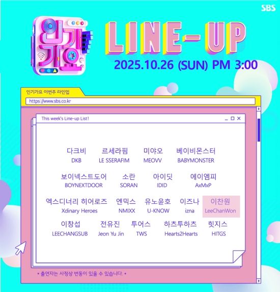 이찬원의 'SBS 인기가요' 컴백 무대는 10월 26일 일요일 오후 3시에 방송된다.