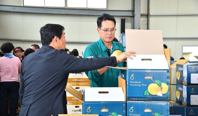 최근 울산 울주 서생농협의 배 산지공판장 개장식이 열린 가운데 이순걸 울주군수가 참석해 배 작황 상태를 확인하고 과수농가 농민들을 격려했다. 이런 가운데 울주군은 지역 대표 과일인 울산배의 해외시장 판로를 개척하기 위해 미국에 홍보단을 파견한다. 울주군은 10월 29일부터 11월 6일까지 미국에 홍보단을 보내 울산배의 우수성을 홍보하고 현지 시식회 등 적극적인 마케팅을 펼칠 예정이라고 밝혔다. / 울주군 제공-연합뉴스