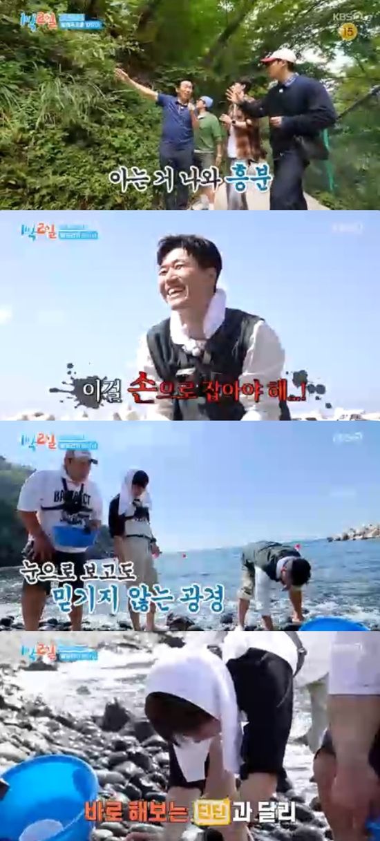 아래팀은 소라찜을 걸고 5분 동안 베도라치 많이 잡기 대결을 시작, 1마리 차이로 김종민이 승리했다.