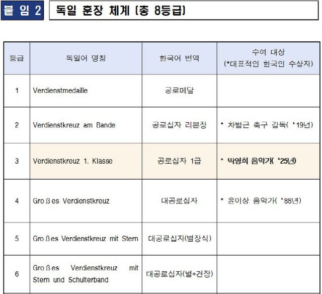 앞서 재독 음악가 윤이상이 1988년 ‘대공로십자훈장’을, 차범근 전 축구대표팀 감독이 2019년 ‘공로십자훈장’을 수훈했다.