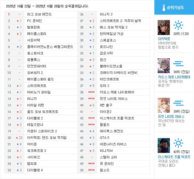 이번 주 게임메카 인기순위에는 특히 신작 진입이 많다. 그 중에도 눈길을 끄는 것은 출시 주간에 급격히 순위를 끌어올린 ‘아키텍트: 랜드 오브 엑자일(이하 아키텍트)’이다. 출시 전부터 40위대에 자리했고, 지난 22일 정식 서비스를 시작한 직후 23계단을 뛰어 20위까지 치솟았다. MMORPG에서 잔뼈가 굵은 아이온을 1주 만에 제치고 TOP 20에 들며 두각을 드러냈다. 순위권에 안정적으로 안착한 마비노기 모바일에 이어 MMORPG에 새바람을 일으킬 수 있느냐가 관심사로 떠오른다.