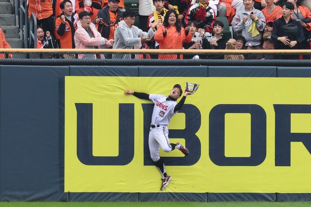 박해민은 26일 KS 1차전 1회 초 1사 1루에서 문현빈의 좌중간 홈런성 타구를 담장 앞에서 뛰어올라 잡아냈다. 1루를 밟고 2루로 쇄도하며 이 장면을 본 문현빈은 머리를 감싸 쥐며 아쉬운 마음을 감추지 못했다.