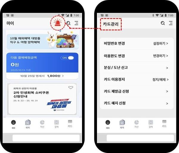 개선방안이 시행되면 앱이나 홈페이지 첫 화면에 새롭게 배치되는 빨간색 사이렌 버튼을 눌러 이용정지·해지 등 핵심 카드관리 메뉴를 이용할 수 있다.