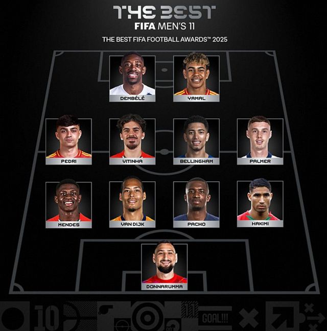 올해의 남자 베스트11에는 PSG에서 2024~2025시즌을 보낸 선수가 6명이나 포함됐다. 뎀벨레와 돈나룸마를 비롯해 아슈라프 하키미, 윌리안 파초, 누누 멘데스, 비티냐 등이 이름을 올렸다. 그외 선수들 중에는 버질 반 다이크(리버풀), 콜 파머(첼시), 주드 벨링엄(레알 마드리드), 페드리(바르셀로나), 야말이 선정됐다. PSG의 압도적인 시즌이 입증된 셈이다. FIFA 푸스카스상은 산티아고 몬티엘(인데펜디엔테)이 기가 막힌 오버헤드킥으로 받았다.
