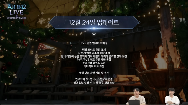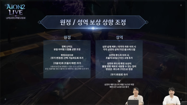 이외에도 이날 방송에서는 검성, 수호성, 호법성, 궁성, 마도성, 치유성 등 클래스를 대상으로하는 세세한 밸런스 상향 조정 계획, 슈고 페스타를 포함한 편의성 개선, 24일 PvP 중심 업데이트 등 다양한 소식이 전해졌다.