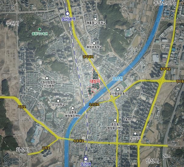 사업 대상지는 경기대로 등 주요 간선도로와 인접해 접근성이 우수하며, 인근 오산대역(1호선)과 버스정류장이 가까이 위치해 광역 교통망 이용이 용이하다. 이에 따라 주변 도로망 및 상권 접근성 개선 등 주거환경 전반의 질적 향상이 기대된다.