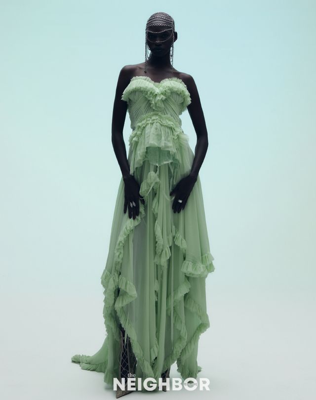 McQueen 라이트 그린 컬러의 러플 이브닝드레스 1천5백33만원.