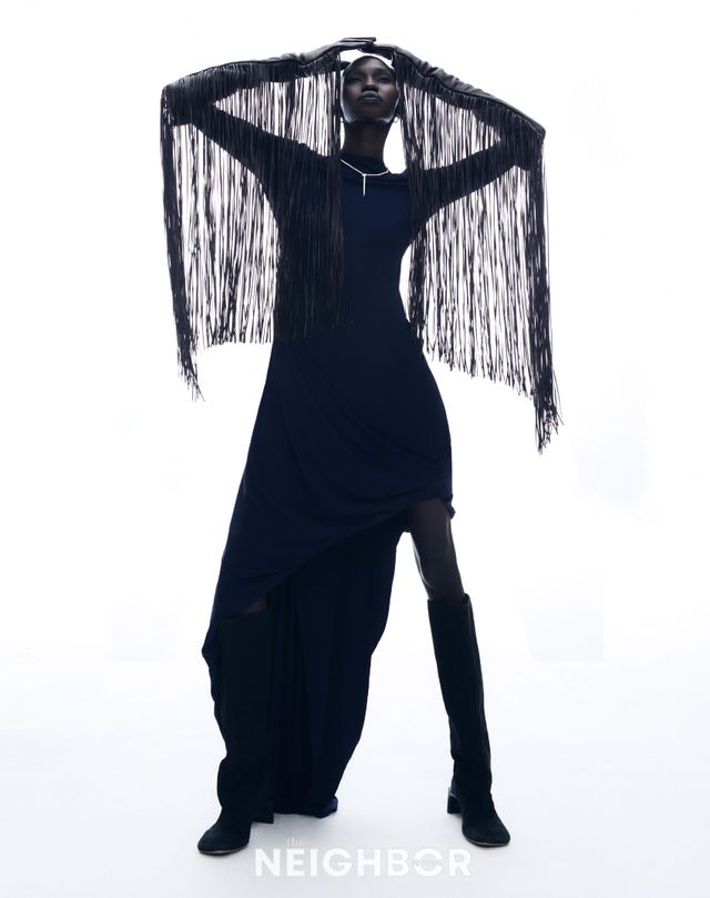 Sportmax 등을 감싸 어깨 위로 이어지는 드라마틱한 드레이프가 돋보이는 저지 드레스 2백48만원, 프린지 장식 레더 글러브 가격 미정, 돌출된 힐을 장착한 스웨이드 롱부츠 모두 가격 미정.