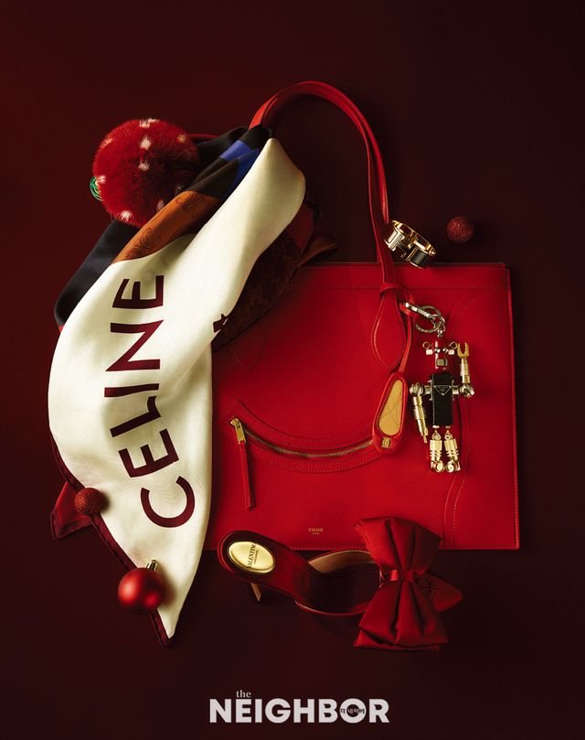Celine 플랫한 글로시 카프스킨 러기지 백 2백85만원, 하우스를 상징하는 패턴을 프린팅한 실크 스카프 82만원.