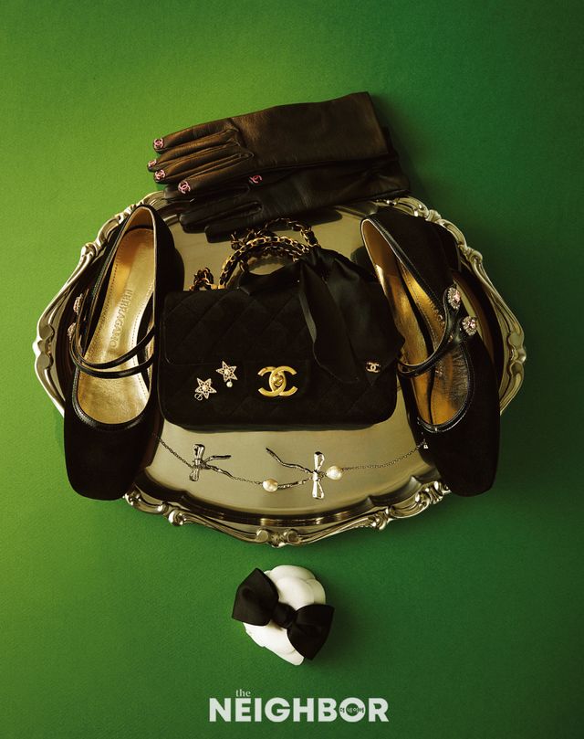 Chanel 핑크 CC 로고 램스킨 글러브, 톱핸들에 리본을 장식한 벨벳 플랩 백, 리본을 더한 까멜리아 실크 브로치 모두 가격 미정.