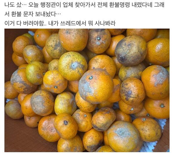 하지만 실제로 도착한 귤은 겉면이 썩거나 곰팡이가 핀 상태였고, 일부는 손으로 만졌을 때 물컹한 느낌이 들 정도로 부패가 진행된 것으로 드러났다.