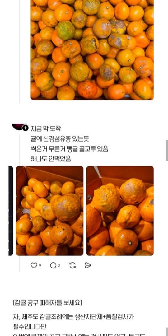 여기에 더해 피해자들은 “공짜로 줘도 못 먹을 상태”라며 분노했고, 제주도산 감귤이라는 점을 믿고 구매했지만 소비자 보호는커녕 무책임한 대응에 실망을 감추지 못했다.