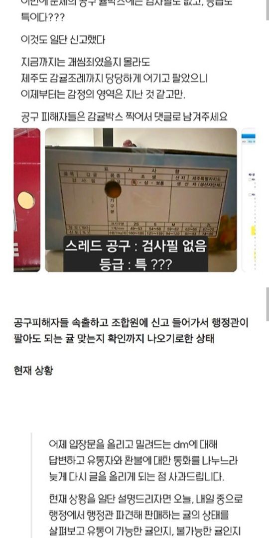 그럼에도 불구하고 썩거나 곰팡이가 핀 귤이 배송되었다는 점은 유통 구조 전반에 허점이 있다는 방증이라는 것이다. “예전에는 저런 귤은 판매는커녕 육지로 보내지도 못했는데 이제는 공구라는 명목으로 아무 기준 없이 유통되고 있다”며 비판하는 글도 다수 올라왔다.