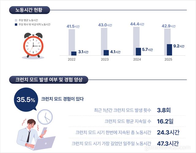크런치 모드 경험률은 35.5%로 지난해(34.3%)와 비슷한 수준이다. 그러나 평균 지속일은 16.2일로 전년(7.4일) 대비 두 배 넘게 늘어났다. 상시적인 업무량 증가(42.0%), 시스템 오류(40.6%) 등 구조적 요인에 따른 결과로 나타나, 업무 프로세스 개선이 필요한 것으로 분석됐다.