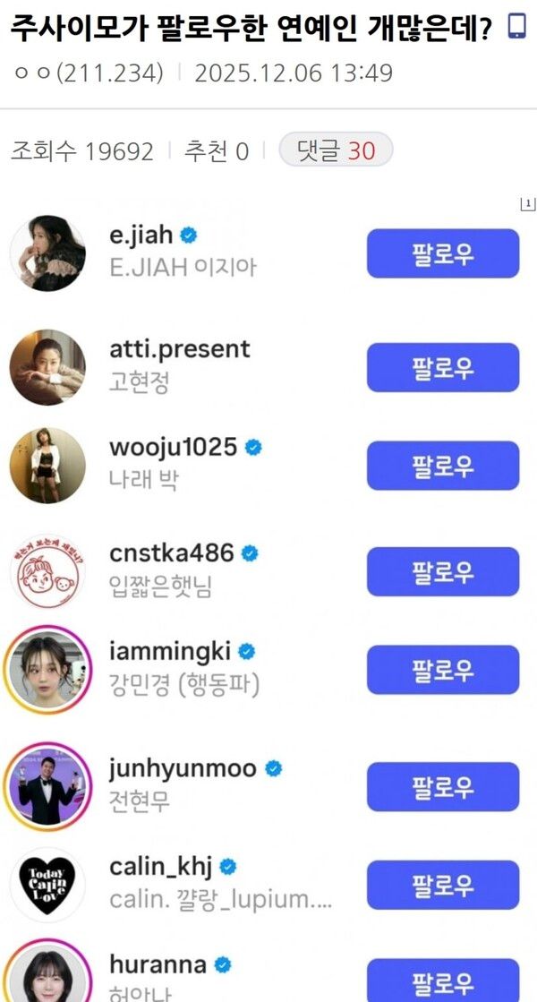 함께 주사 이모 인스타를 팔로우 하고 있는 연예인들 리스트도 함께 화제가 되고 있다.