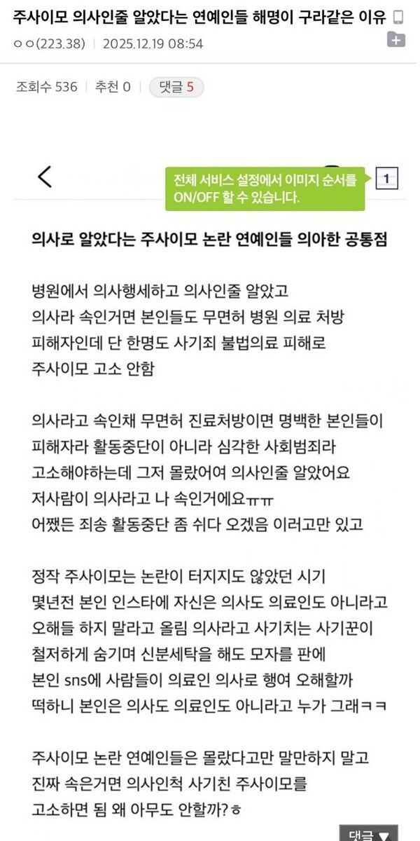 의료인의 자격 여부를 철저히 확인하지 않은 채 관계를 맺고, 이를 방송 활동 및 건강 관리에 활용해 온 일부 연예인의 부주의도 함께 도마에 오르고 있다.