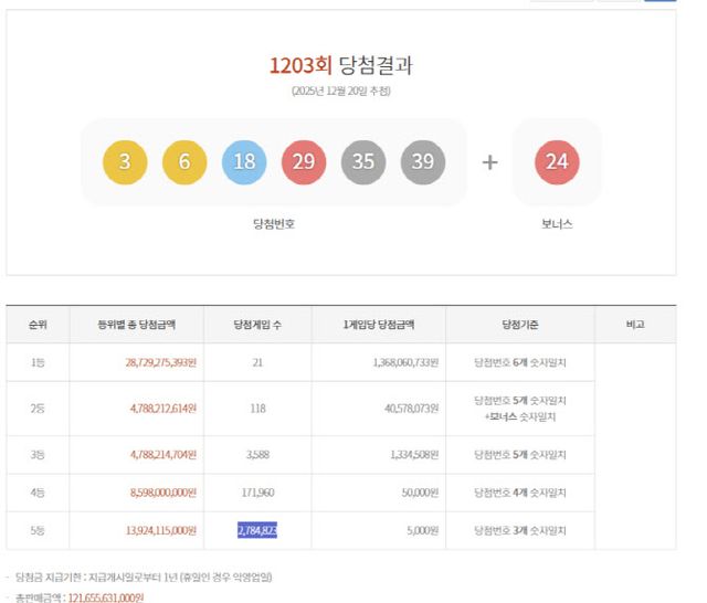로또복권 운영사 동행복권은 제1203회 동행복권 로또 추첨 결과 ‘3, 6, 18, 29, 35, 39’가 1등 당첨 번호로 결정됐다고 13일 밝혔다. 보너스 번호는 ‘24’이다