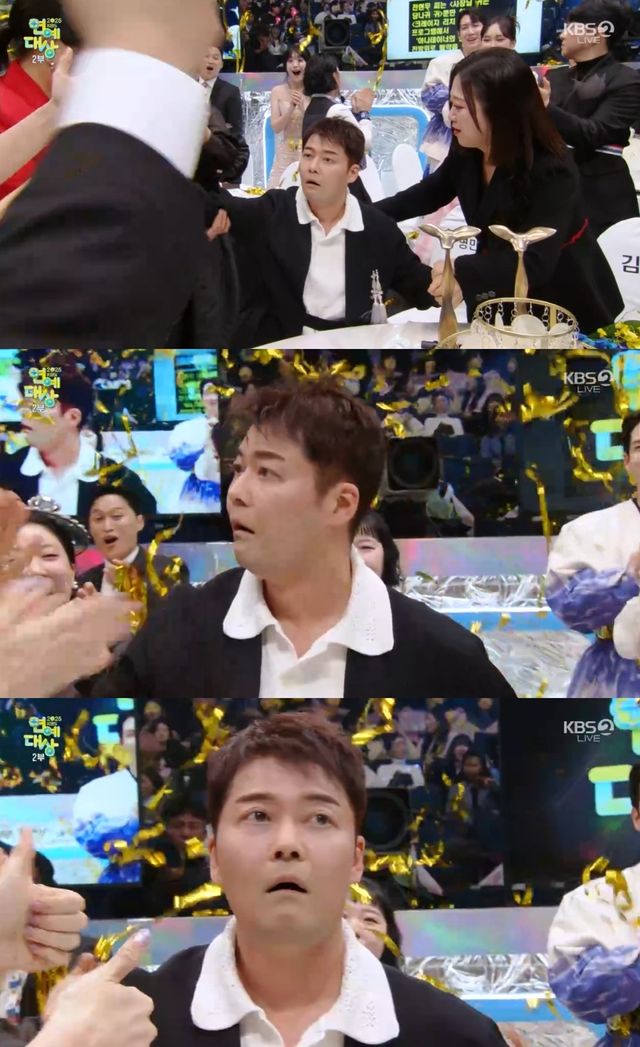 자신의 이름이 호명되자 전현무는 예상치 못한 결과에 놀란 기색을 숨기지 못한 채 무대에 올랐다.