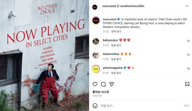 ‘어쩔수가없다’의 미국 배급사인 영화사 네온은 이날 웹사이트와 소셜미디어를 통해 “‘영화의 걸작’, 박찬욱의 ‘어쩔수가없다’(영어 제목 No Other Choice)가 선별된 극장에서 상영 중”이라며 “1월에는 전역에서”(Everywhere January) 상영된다고 알렸다.