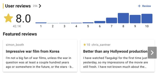해외 관객의 반응은 온라인 평점을 통해 확인된다. 영화 평점 사이트 IMDb에서 이날 현재 '태극기 휘날리며'는 8.0점을 기록하고 있다. 256건의 해외 관객 리뷰가 등록돼 있는데, 외국어 전쟁영화로서는 꽤 높은 점수다.