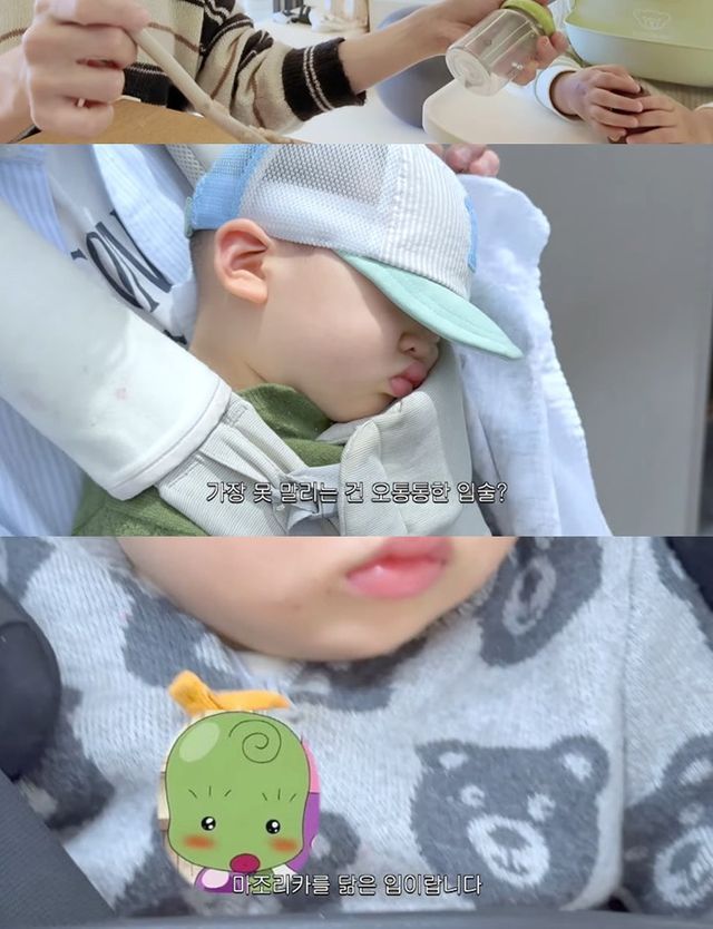 이어 거실로 이동해 인터뷰에 재도전한 손연재는 치즈를 먹는 아들의 모습을 비추며 "못 말리는 치즈 사랑. 그래도 가장 못 말리는 건 오동통한 입술? 마조리카를 닮은 입이다"며 통통하게 나와 있는 아들의 입 모양을 소개했다.