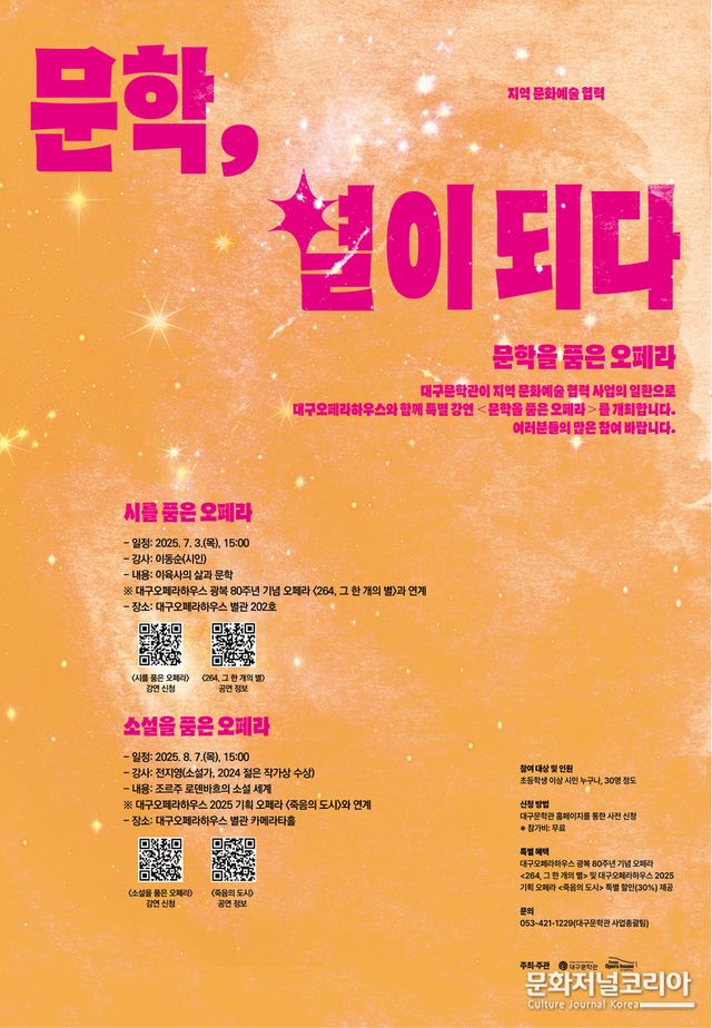 '시를 품은 오페라' 강연은 7월 3일(목) 15시에, '소설을 품은 오페라' 강연은 8월 7일(목) 15시에 대구오페라하우스 별관 카메라타에서 무료로 진행된다. 이번 강연에 대한 정보는 대구문학관 홈페이지를 통해 확인할 수 있고, 대구오페라하우스 하반기 기획 오페라 <264, 그 한 개의 별>과 <죽음의 도시>에 대한 공연 정보 및 예매는 대구오페라하우스 홈페이지(https://www.daeguoperahouse.org/)에서 확인할 수 있다. 이와 관련한 문의는 053-430-7400으로 하면 된다.
