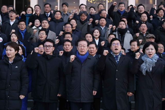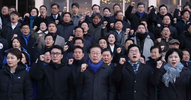 더불어민주당의 이재명 대표와 박찬대 원내대표를 비롯한 의원들이 2024년 12월 7일 서울 여의도 국회에서 윤석열 대통령 탄핵 등 구호를 외치고 있다. / 뉴스1