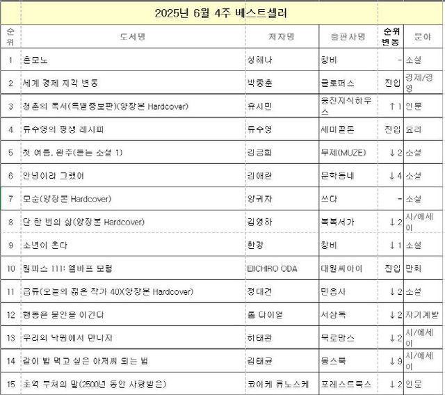 한편 박종훈 전 KBS 기자의 책 ‘세계 경제 지각 변동’은 지난달 27일 출간과 동시에 2위를 기록했다. 교보문고는 “국내외 격변하는 경제 상황에 대한 대비를 위해 독자들의 관심이 두드러진 것”이라며 “트럼프 행정부의 관세 정책과 불안한 국제 정세가 국가뿐만 아니라 개인의 투자에도 영향을 미친 것으로 보인다”고 분석했다.