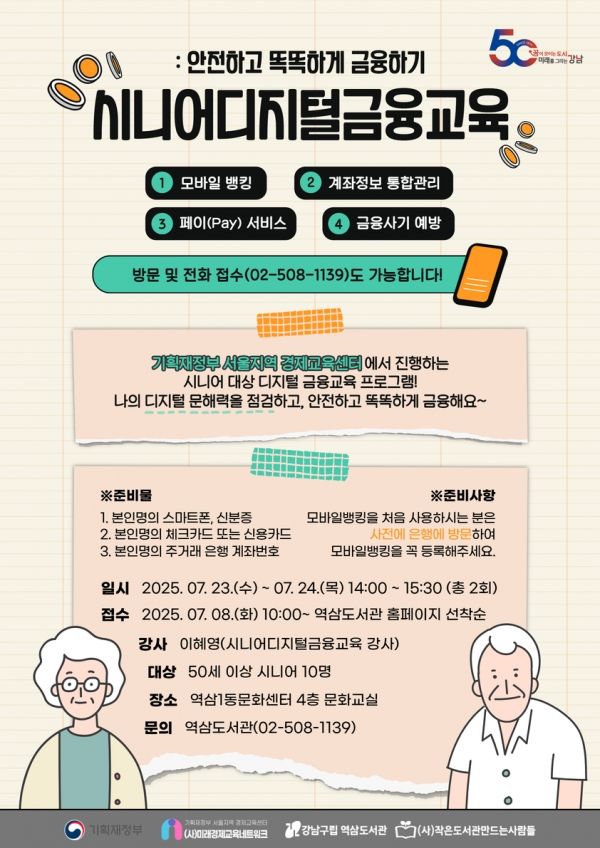 강남구립역삼도서관이 시니어를 대상으로 한 금융교육 프로그램 ‘시니어디지털금융교육: 안전하고 똑똑하게 금융하기'를 오는 23일과 24일 진행한다.
